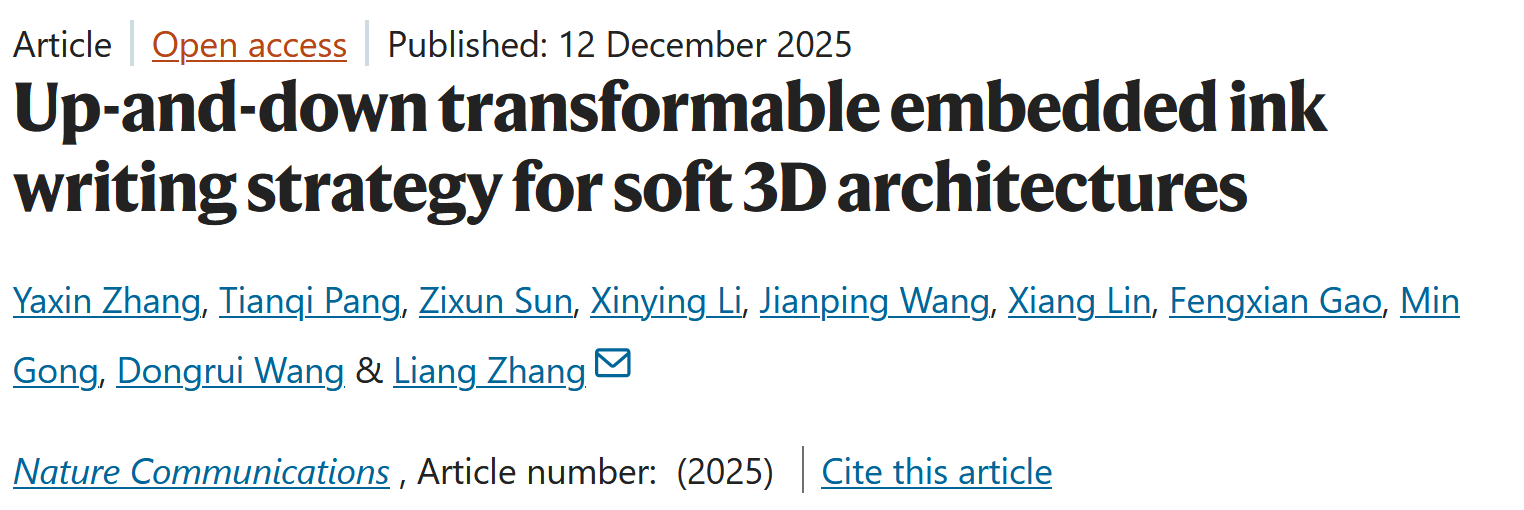 成人在线 成人在线 张靓副教授最新研究成果——沉浮式墨水直写3D成型技术,以“Up-and-Down Transformable Embedded Ink Writing Strategy for Soft 3D Architectures”为题发表于国际顶级期刊《Nature Communications》。成人在线-91porn-麻豆视频 为该论文的唯一通讯单位,第一作者为成人在线-91porn-麻豆视频 22级博士生张娅欣。