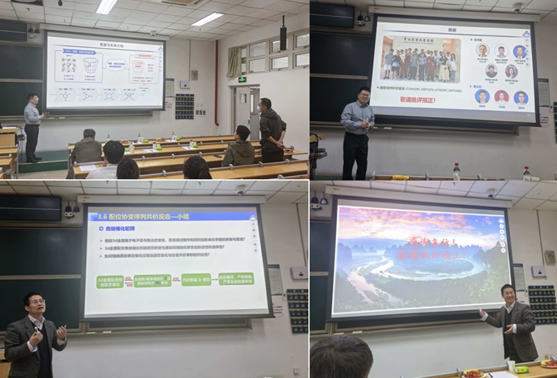 张伟雄教授现任中山大学教授、博士生导师,化学成人在线 副院长,主持承担面上项目、优青项目、联合基金重点项目等多项国家自然科学基金项目,现兼任含能材料全国重点实验室学术委员、中国化学会第31届理事会青年委员、广东省化学会第9届委员会常任理事。他围绕多离子集成含能材料的设计理念、构筑方法、性能及应用等问题,系统介绍了其团队在离子型杂化材料与含能材料领域的代表性成果。张教授重点阐述了如何通过阴离子导向组装实现新型含能材料的创新设计,并展示了创制的无需硝化、易于放大生产、兼具军民应用潜力的多离子集成含能材料体系。报告还介绍了其团队构建的从基础研究到应用转化的全链条单质炸药创新体系的相关进展,其中典型化合物已实现吨级量产,其关键技术在关键领域已完成工程化应用。他的报告充分体现了基础研究与工程转化紧密衔接的鲜明特色,也为在场师生理解功能材料从实验室研究走向实际应用提供了重要启发。